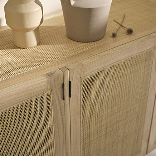 Cette collection Maël, nous l’avons souhaité tout en douceur, tout en rondeur. Nous craquons pour les lignes franches et minimalistes de notre buffet en bois de mindi et cannage MAËL. Ses quatre portes finement tissées en fibres naturelles vous permettront de ranger avec élégance votre vaisselle et linge de maison subtilement visibles à travers le cannage.