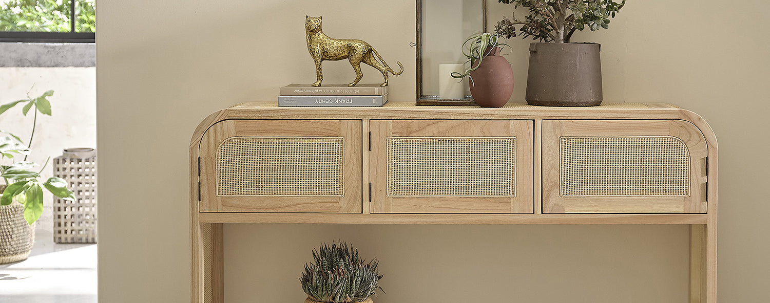 La console en bois de mindi et cannage MAËL ne déroge pas à la règle : bois massif de mindy, cannage finement tressé et forme arrondie. C’est ainsi que cette console donne le ton : à la fois épurée, claire et apaisante. Dans le séjour, cette console est très pratique pour ranger les objets du quotidien : livres, dossiers ou affaires personnelles. N’oubliez pas d’exposer divers objets déco qui vous plaisent ou qui vous rappellent de bons souvenirs.